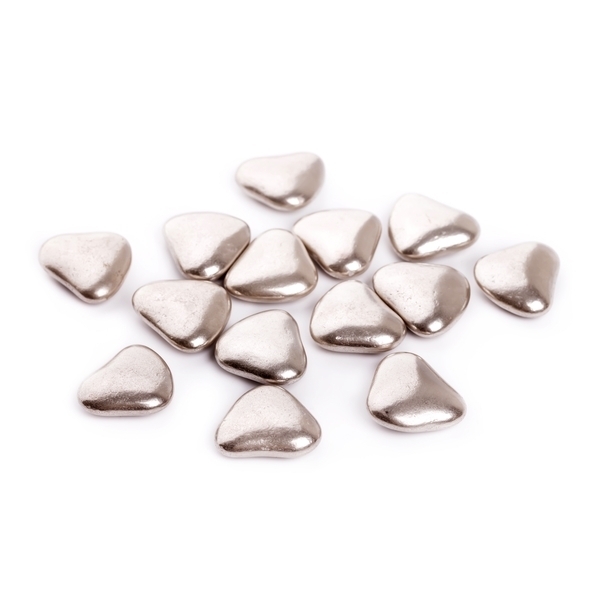 Декор для тортов и пирожных в виде серебряных сердечек. Съедобное украшение серебряного цвета, внутри из шоколада покрытое сахарной глазурью.